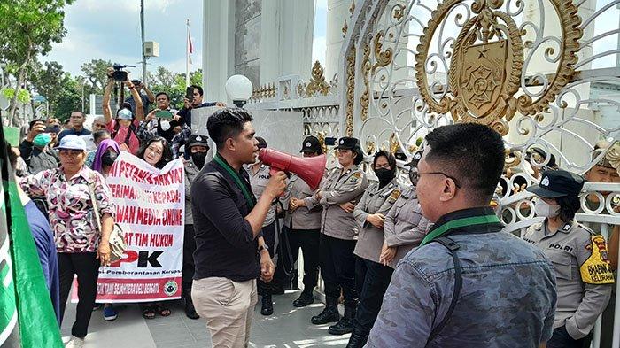 TRIBUN-MEDAN.com, MEDAN - Badan Koordinasi Himpunan Mahasiswa Islam (Badko HMI) Sumatera Utara bersama kelompok Tani di sekitar lahan Sport Center menggeruduk kantor Gubernur Sumut di Jalan Diponegoro Medan, Kamis (30/3/2023).