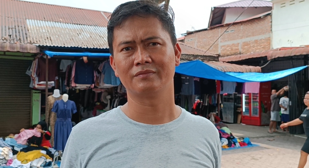Raja Simbolon pedagang pakaian bekas di Pasar Simalingkar, Kecamatan Medan Tuntungan mengalami kerugian hingga Rp 10 juta per bulannya.