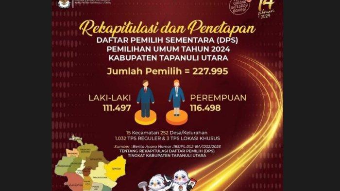 "Rekapitulasi dan penetapan daftar pemilih sementara (DPS) pemilihan umum tahun 2024 Kabupaten Tapanuli Utara, jumlah pemilih sebanyak 227.995 pemilih," ujar Kopman Pasaribu, Minggu (16/4/2027).