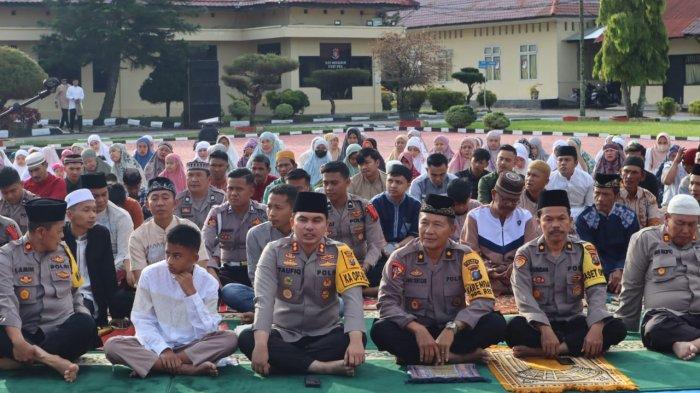 Kapolres Toba AKBP Taufiq Hidayat Thayeb SH, SIK menunaikan Sholat Ied beresama 300 orang jamaah dari Ibu Bhayangkari, Personil Polres Toba
