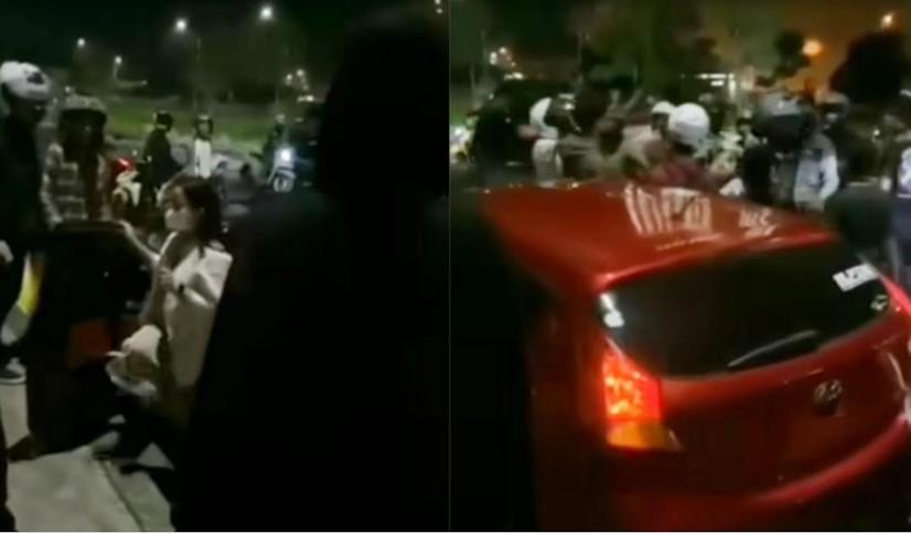 Namun warga yang berada di lokasi tampak masih emosi dan memukul mobil berwarna merah itu. Terlihat helm para pengendara motor beberapa kali dipukulkan ke mobil merah itu.