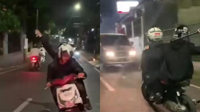 Dengan rasa percaya diri, salah satu angota geng motor yang dibonceng itu kemudian mengacungkan tongkat baseball sambil memutar-mutarkannya.