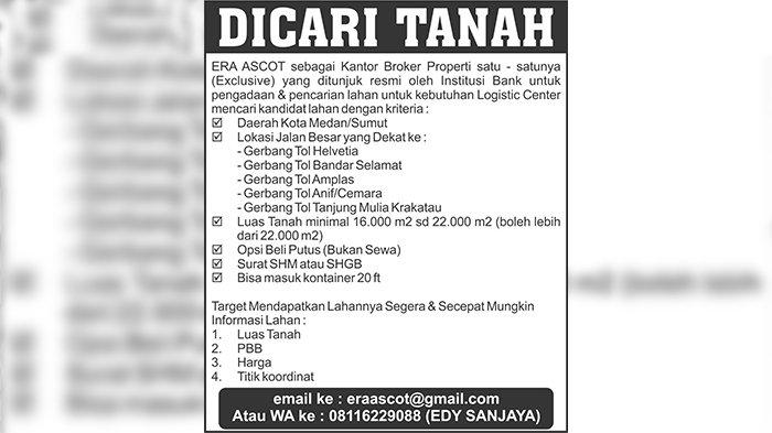 TRIBUN-MEDAN.com, MEDAN - ERA ASCOT sebagai Kantor Broker Properti satu-satunya (Exclusive) yang ditunjuk resmi oleh Institusi Bank untuk pengadaan dan pencarian lahan untuk kebutuhan Logistic Center mencari kandidat lahan dengan kriteria :