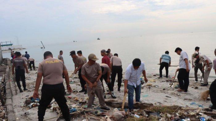 TRIBUN-MEDAN.COM, BELAWAN-Polres Pelabuhan Belawan melaksanakan kegiatan peduli lingkungan dengan tema "Membersihkan Sampah Serentak Bersama Polri" di Pantai Ocean Pacific Belawan, Kamis (13/7/2023).