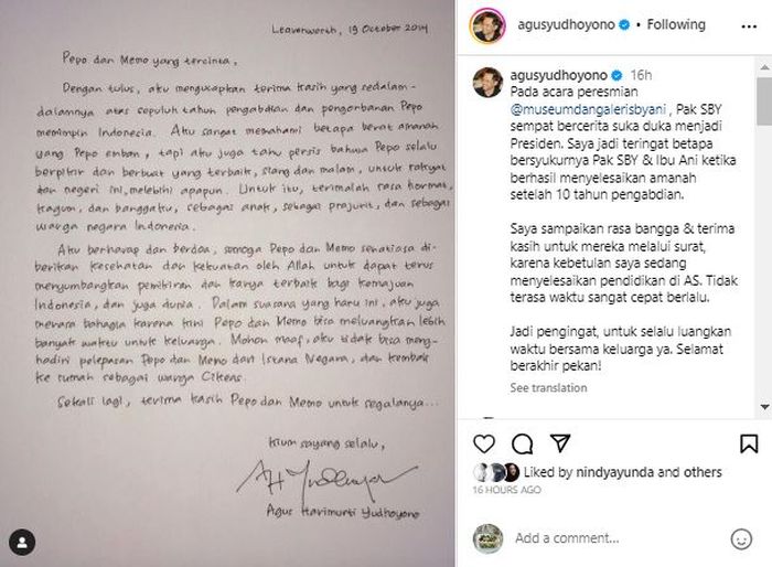 "Saya sampaikan rasa bangga & terima kasih untuk mereka melalui surat, karena kebetulan saya sedang menyelesaikan pendidikan di AS. Tidak terasa waktu sangat cepat berlalu," tulisnya.