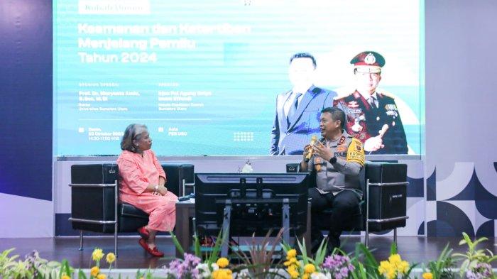 Kapolda Sumut Irjen Pol Agung Setya Imam Effendi memberikan kuliah umum di Universitas Sumatera Utara (USU), Senin (23/10/2023).