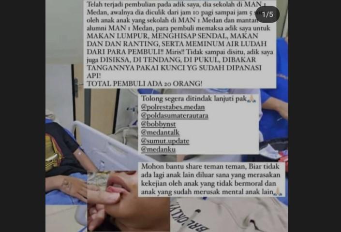 Satu Siswa di Madrasah Aliyah Negeri (MAN)1 Kota Medan menjadi korban pembullyan dan penyiksaan oleh teman-temannya dan viral di sosial media.