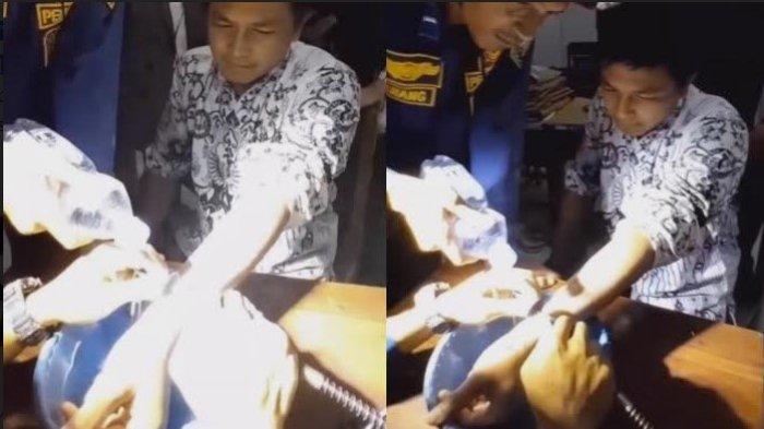 Diketahui, tangan guru tersebut terborgol saat tengah bermain teater untuk memperingati hari guru nasional.