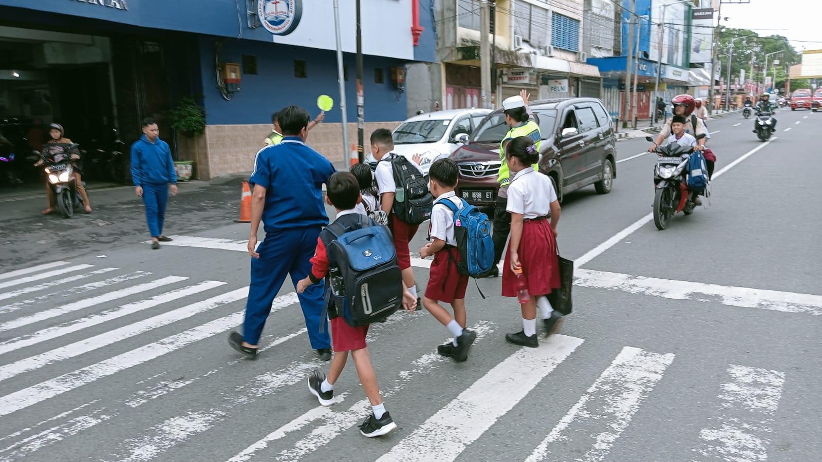 Polres Pematang Sainatar dan Polsek Jajaran Jaga Anak Sekolah di Lokasi Rawan Laka