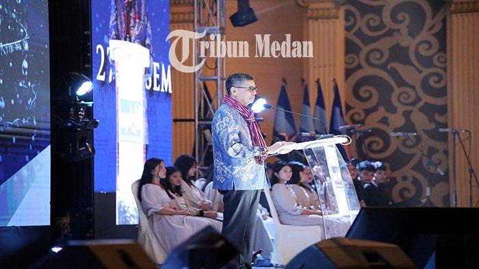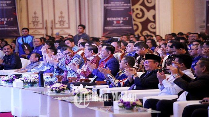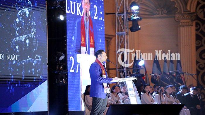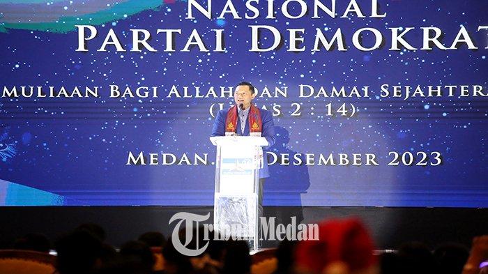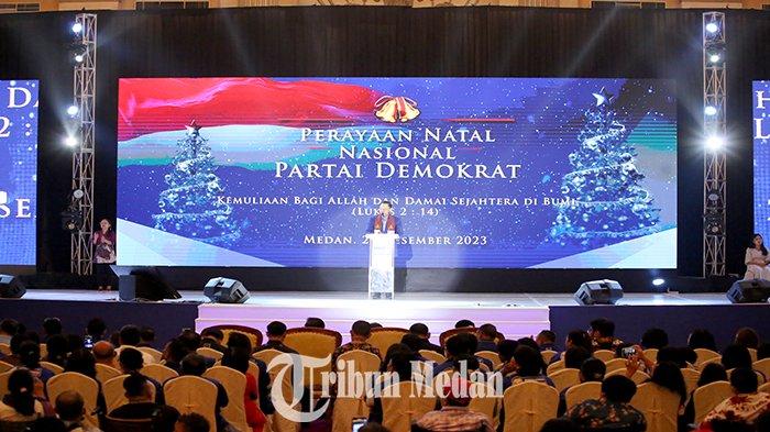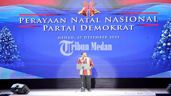 TRIBUN-MEDAN.com, MEDAN - Mantan presiden ke 6 Indonesia yang juga sekaligus Ketua Majelis Tinggi Partai Demokrat, Susilo Bambang Yudhoyono menyanyikan lagu Everything I Do dalam perayaan Natal Nasional Demokrat yang digelar di Medan, Rabu (27/12/2023).