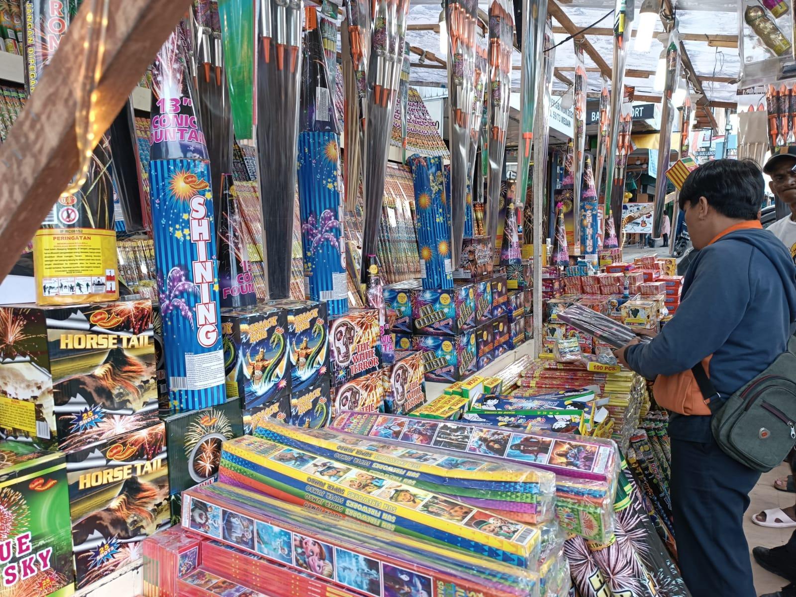 Terlihat, beberapa lapak pedagang dipadati sejumlah masyarakat yang ingin membeli kembang api ataupun terompet untuk merayakan malam pergantian tahun 2024.