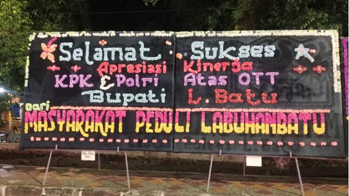 "Selamat dan sukses, apresiasi kinerja KPK dan Polri atas OTT Bupati Labuhanbatu. Dari emak-emak Labuhanbatu," demikian tulisan di salah satu karangan bunga yang berdiri di pinggir jalanan tersebut.