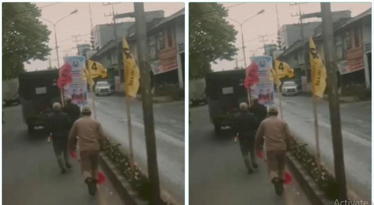 Dalam video berdurasi 1 menit itu terlihat beberapa petugas berseragam Satpol PP mencabuti bendera PDIP yang berdiri berdampingan dengan bendera partai Golkar.