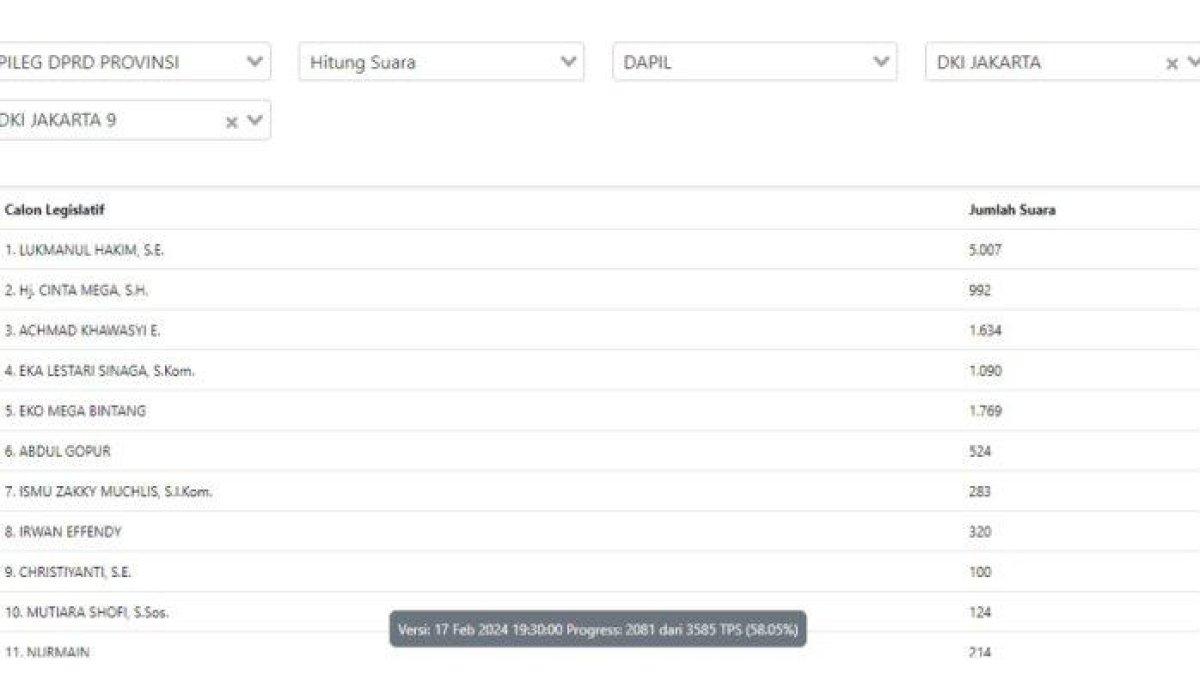 Berdasarkan data masuk 2.081 TPS dari total 3.585 TPS atau 58,05 persen, Cinta Mega hanya mendapat 992 suara.