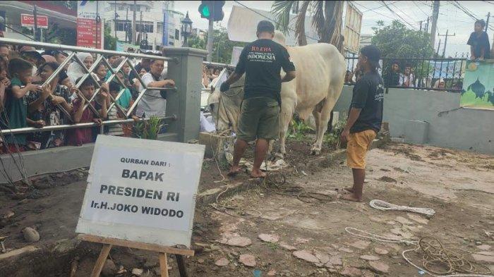 TRIBUN-MEDAN.com, MEDAN - Presiden Joko Widodo menyumbangkan satu ekor sapi untuk dikurbankan ke Masjid Perjuangan 45 Jalan HM Yamin Kecamatan Medan Perjuangan, Senin (17/6/2024).