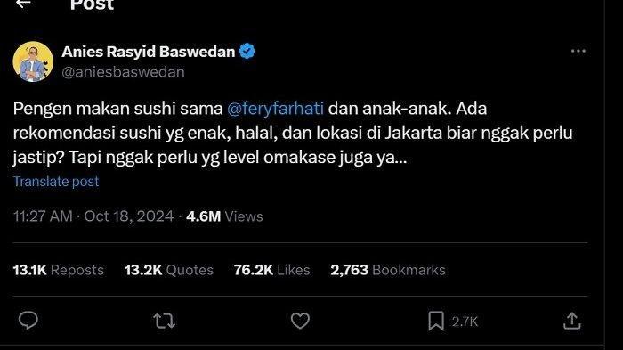 "Pengen makan sushi sama @feryfarhati dan anak-anak. Ada rekomendasi sushi yg enak, halal, dan lokasi di Jakarta biar nggak jastip?" cuitan Anies Baswedan (18/10).