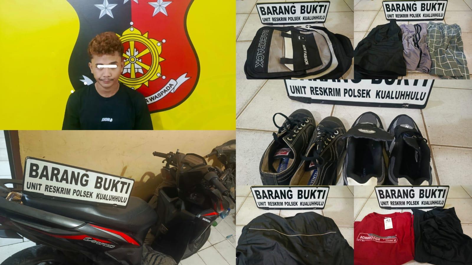 Polisi juga mengamankan sejumlah barang bukti, termasuk satu unit sepeda motor Honda Vario tanpa nomor polisi, dua pasang sepatu, satu buah tas ransel hitam, dua potong kaos, satu jaket hitam, dan tiga potong celana pendek yang diduga digunakan saat aksi kejahatan.