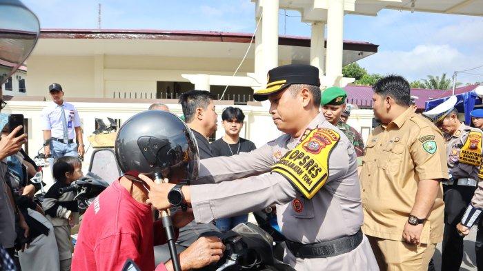 Kapolres Padangsidimpuan AKBP Dr. Wira Prayatna, S.H., S.I.K., M.H., bersama Forkopimda setempat, membagikan helm kepada pengendara roda dua