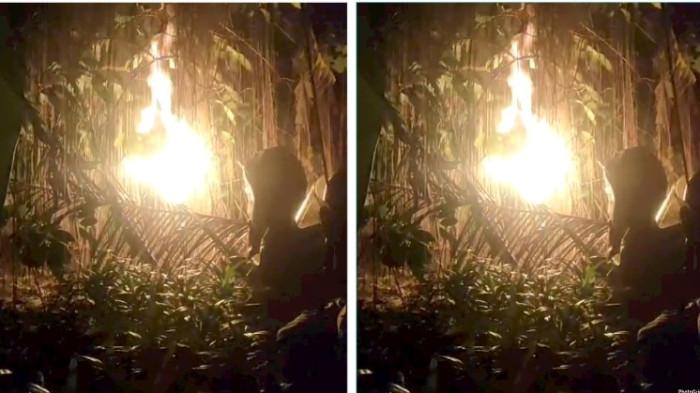 Setelah itu, petugas menyalakan api ke tongkat panjang yang disiapkan, lalu diarahkan ke sarang tawon.