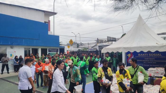 Kantor Imigrasi Kelas I Khusus TPI Medan, Sumatera Utara menyalurkan 2,5 ton beras kepada para ojek online.