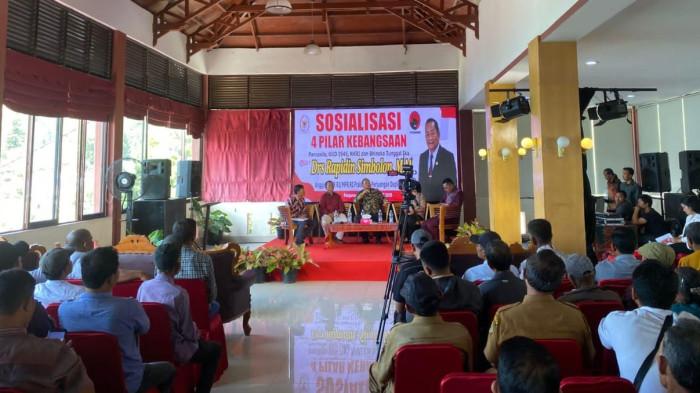 TRIBUN-MEDAN.COM, SAMOSIR-Anggota Komisi XIII DPR RI yang juga Ketua DPD PDI Perjuangan Sumatera Utara, Drs. Rapidin Simbolon MM, menyerukan penguatan nilai-nilai kebangsaan, semangat gotong royong, dan pelestarian budaya lokal dalam kegiatan sosialisasi Empat Pilar MPR RI yang digelar di Pangururan, Kabupaten Samosir, Selasa (30/7/2025).