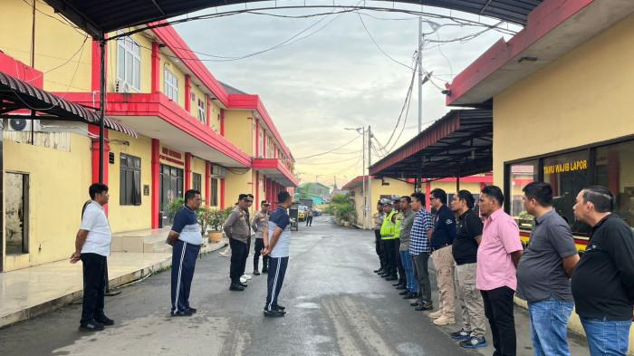 Kasi Propam Polres Pelabuhan Belawan IPTU Rudy Pramudya memberikan arahan kepada personel piket fungsi di halaman Mako Polres