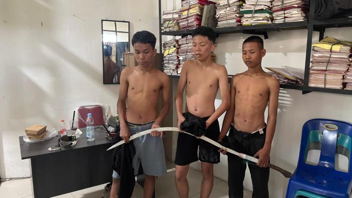 Brimob Polda Sumatera Utara berhasil mengamankan tiga remaja yang kedapatan membawa senjata tajam jenis klewang d