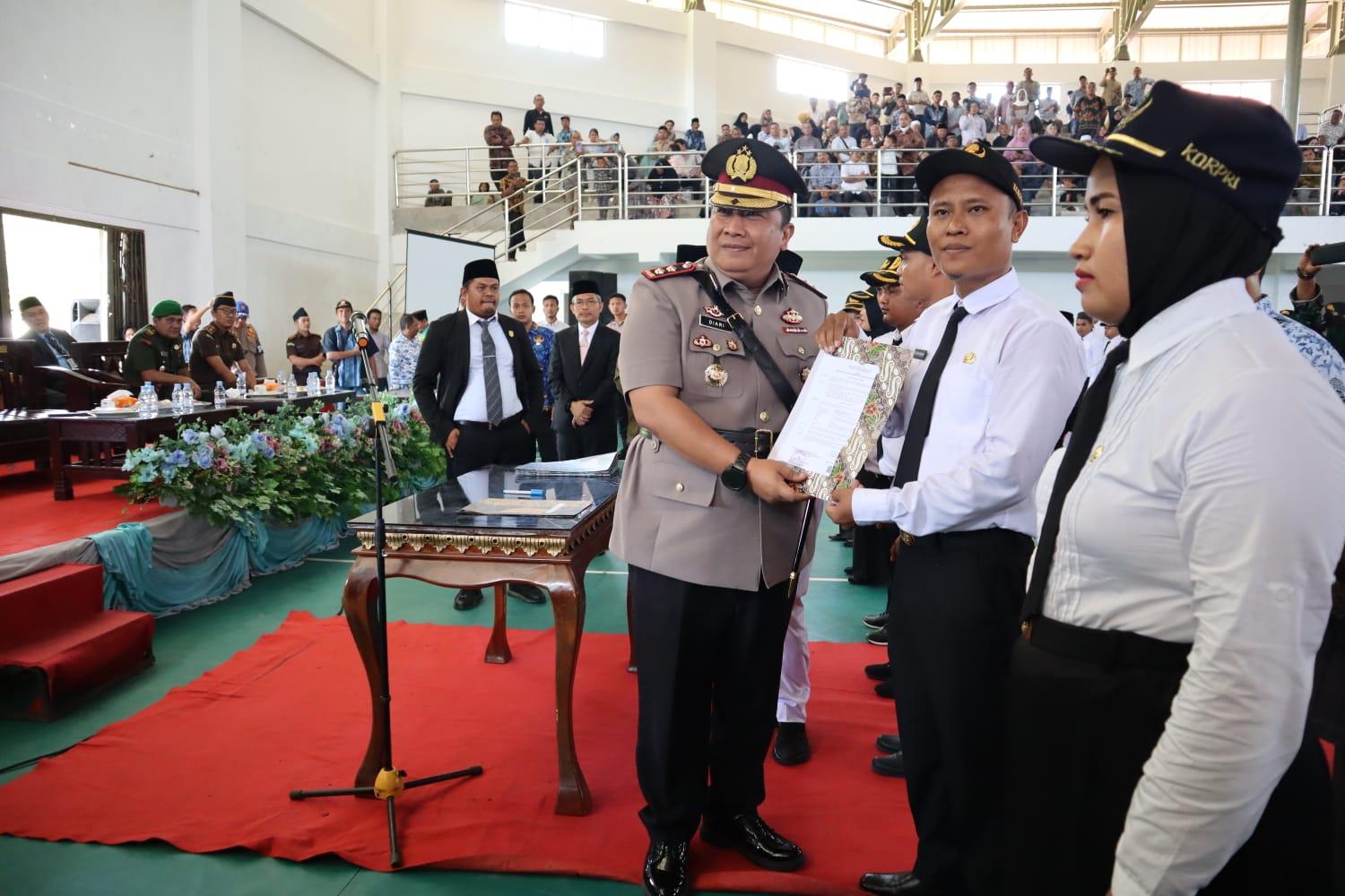 Kapolres Padang Lawas (Palas) AKBP Diari Astetika menghadiri upacara peringatan hari jadi Kabupaten Palas yang ke-16, di Halaman Kantor Bupati