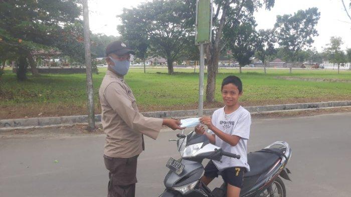 Personil Polsek Lotu Polres Nias Brigadir Joko, membagiakan Masker kepada Warga yang kedapatan tidak memakai Masker demi tegaknya Disiplin Protokol