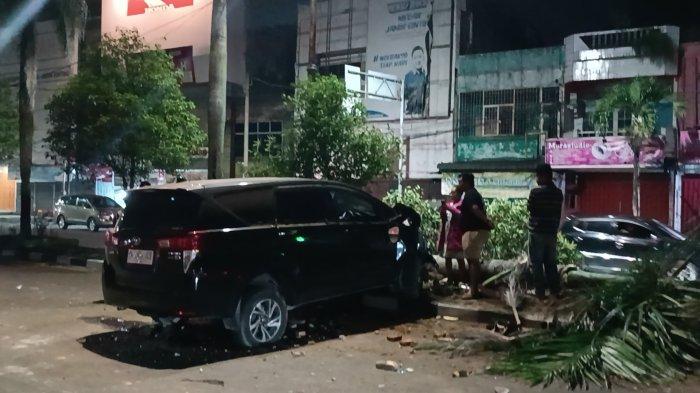 Satu unit mobil Kijang Innova dalam keadaan ringsek setelah menabrak pohon pembatas jalan di Jalan Jamin Ginting