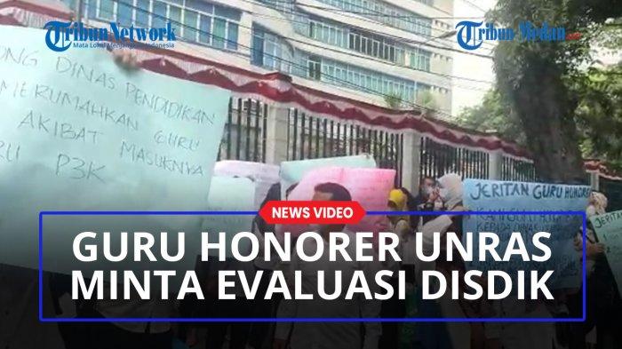 Puluhan guru honorer Kota Medan menggelar aksi unjuk rasa (unras) di depan gedung DPRD, Jalan Abdullah Lubis, Senin (27/6/2022).